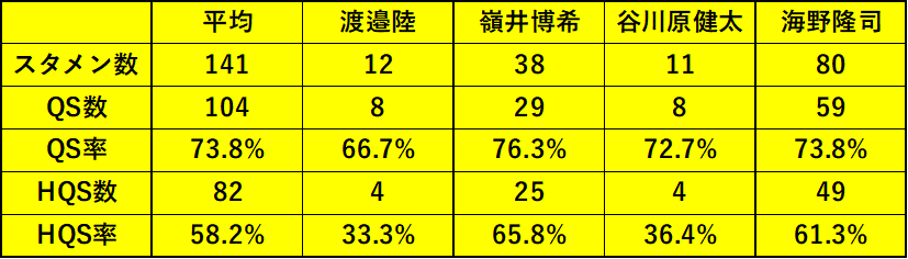 HQS率とは、先発投手が7イニング以上を投げ、自責点2以内に抑えた「High Quality Start(ハイ・クオリティ・スタート)」を記録した割合を示す指標。