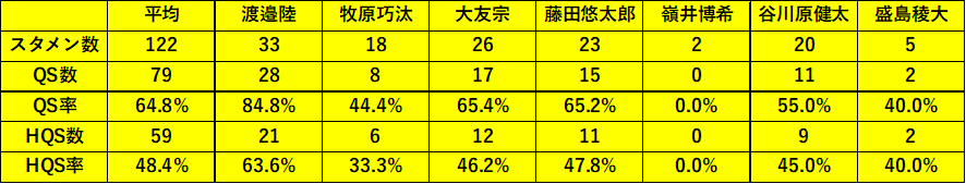 QS率とは、先発投手が6イニング以上を投げ、自責点3以内に抑えた「Quality Start(クオリティ・スタート)」を記録した割合を示す指標。