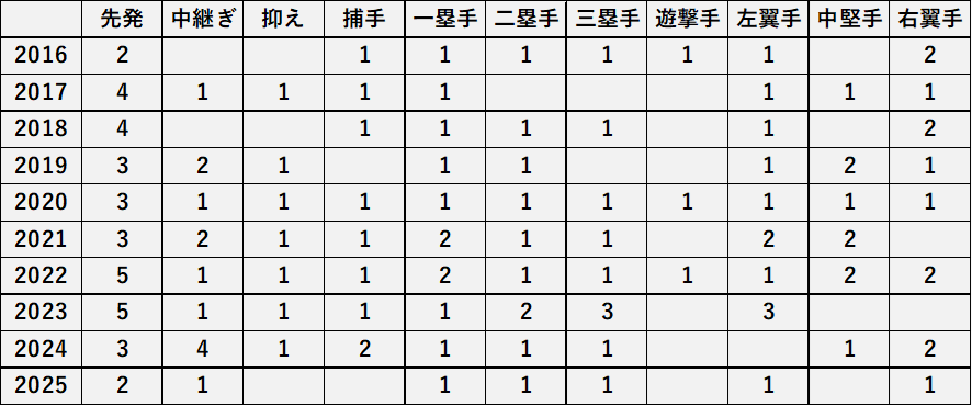 ただこちらの5ポジション「抑え、捕手、遊撃手、中堅手」の登場率は他のポジションより高いのは確かです。