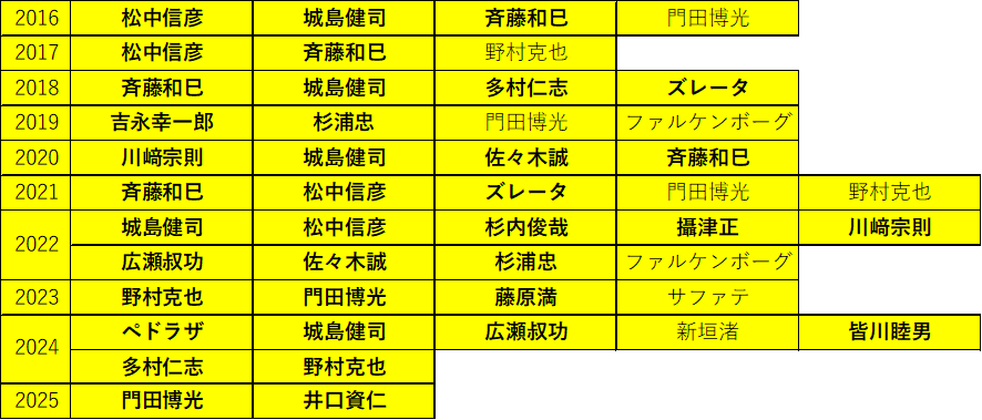 過去TS・OBで登場したホークス選手をメインポジション別にシーズン毎でまとめてみました。