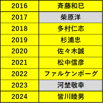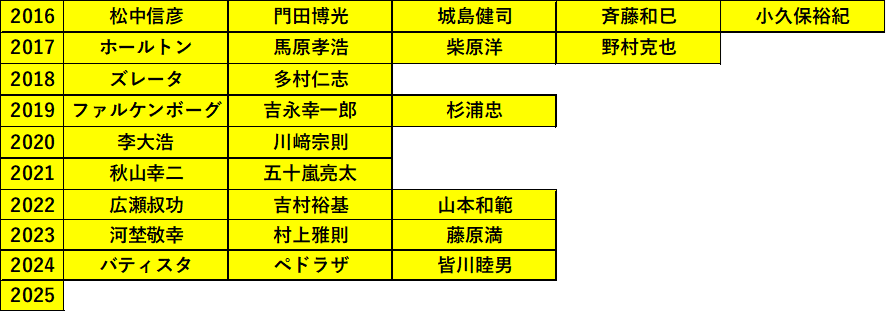 毎年、最低でも2名の新規選手が登場していることが分かります。