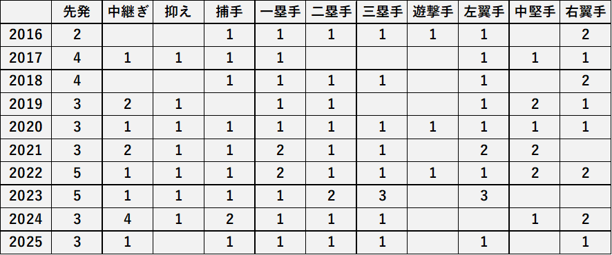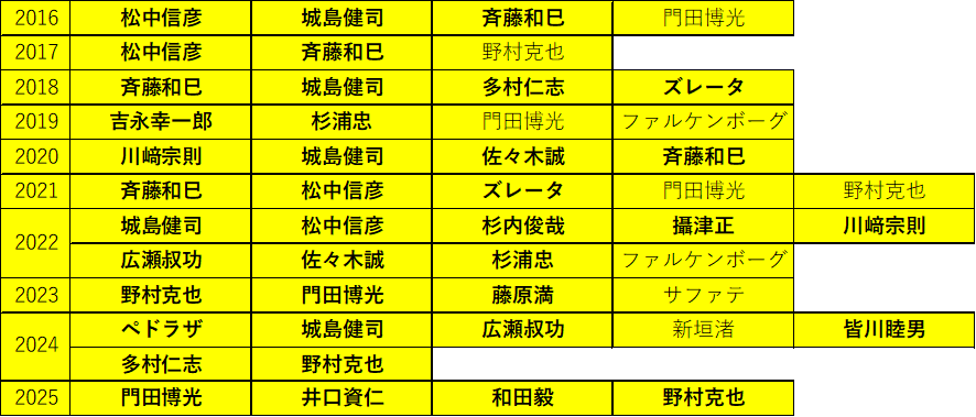 過去TS・OBで登場したホークス選手をメインポジション別にシーズン毎でまとめてみました。